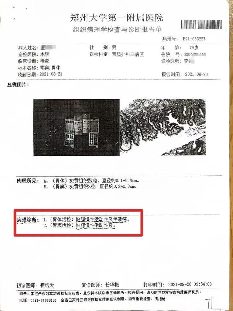 董女士说,手术在8月26日上午进行,父亲被推进手术室半个小时全胃就被切除,术中的冰冻病理学检查没有做。令他们震惊的是,手术后的病理学检查结果均显示父亲胃部并未患癌,依然是胃黏膜慢性炎。
