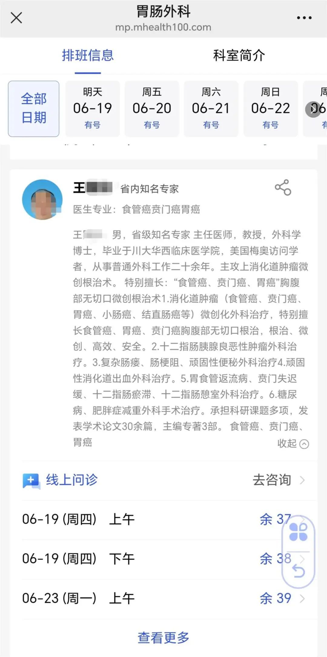6月18日,记者查询郑州大学第一附属医院微信公众号发现,进入预约挂号界面后,选择该院河医院区的胃结直肠外科医学部,胃肠外科的排班信息里,上述事件涉事的王某俊医生目前可以挂号,其中6月19日(周四)上午、下午均有30多个余号。